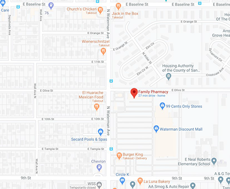 Your refills can be ordered by using a computer or smart phone. Your must register for the first time with your birthday, telephone and one of your prescription numbers. Input our pharmacy name (Family Pharmacy), phone Number (909-884-2739) and our zip code 92410. Please allow us at least few hours before you would like to pick up.